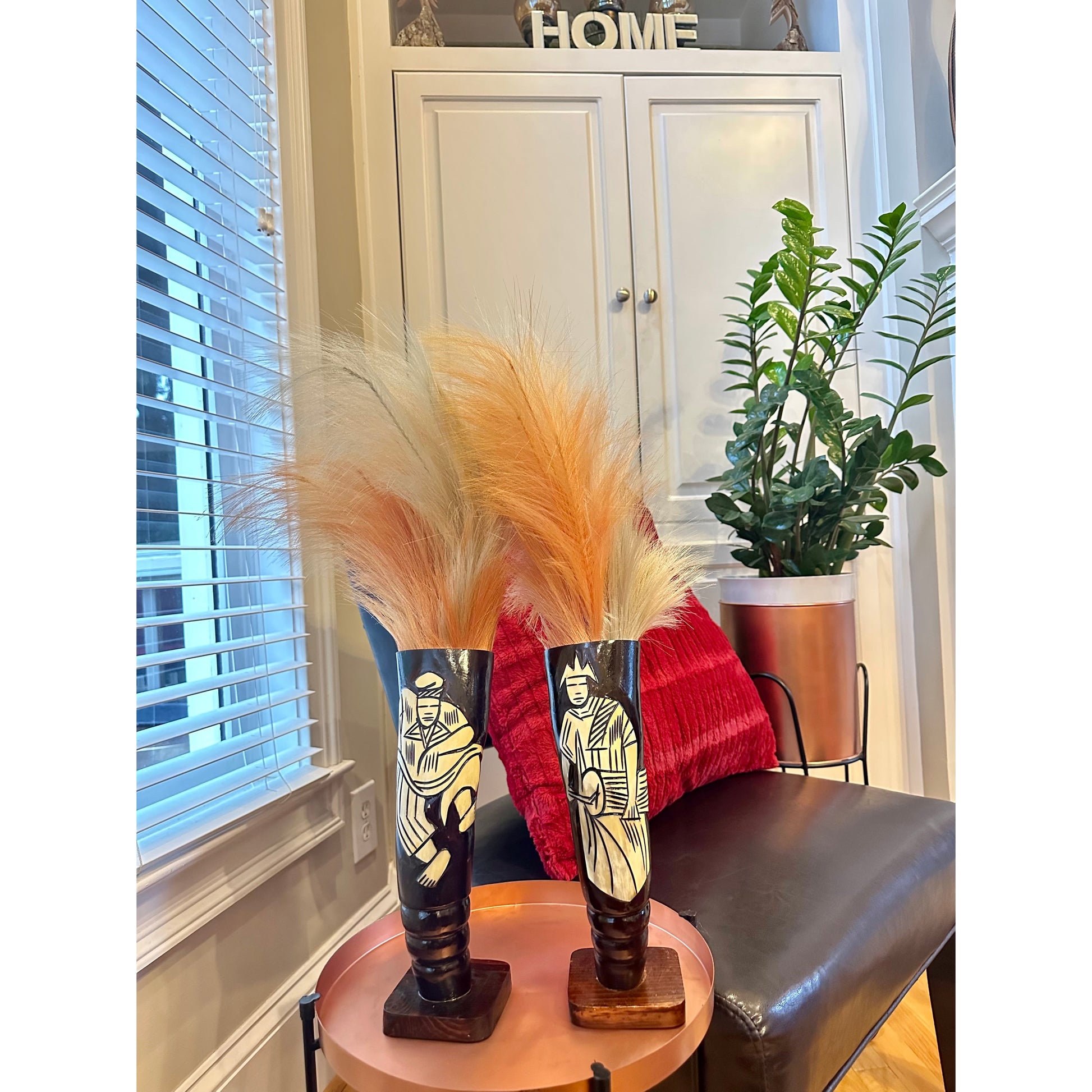 This 2pc hand-carved and tribal decorative flower vase set is made from ethically sourced West African cow horns. Suitable for your home, gallery, or office decoration.
