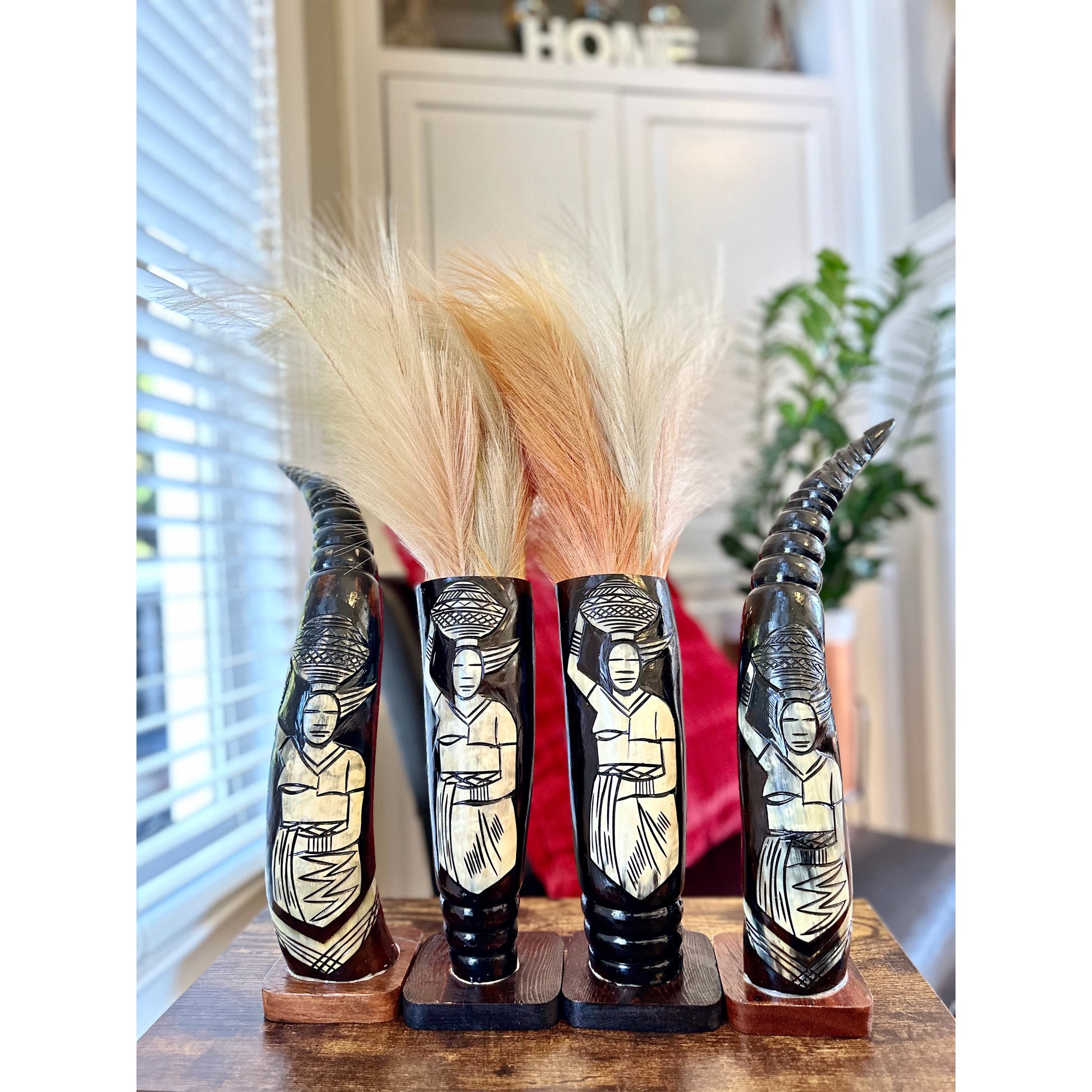 This 2pc hand-carved and tribal decorative full horn set is made from ethically sourced West African cow horns. Suitable for your home, gallery, or office decoration.
