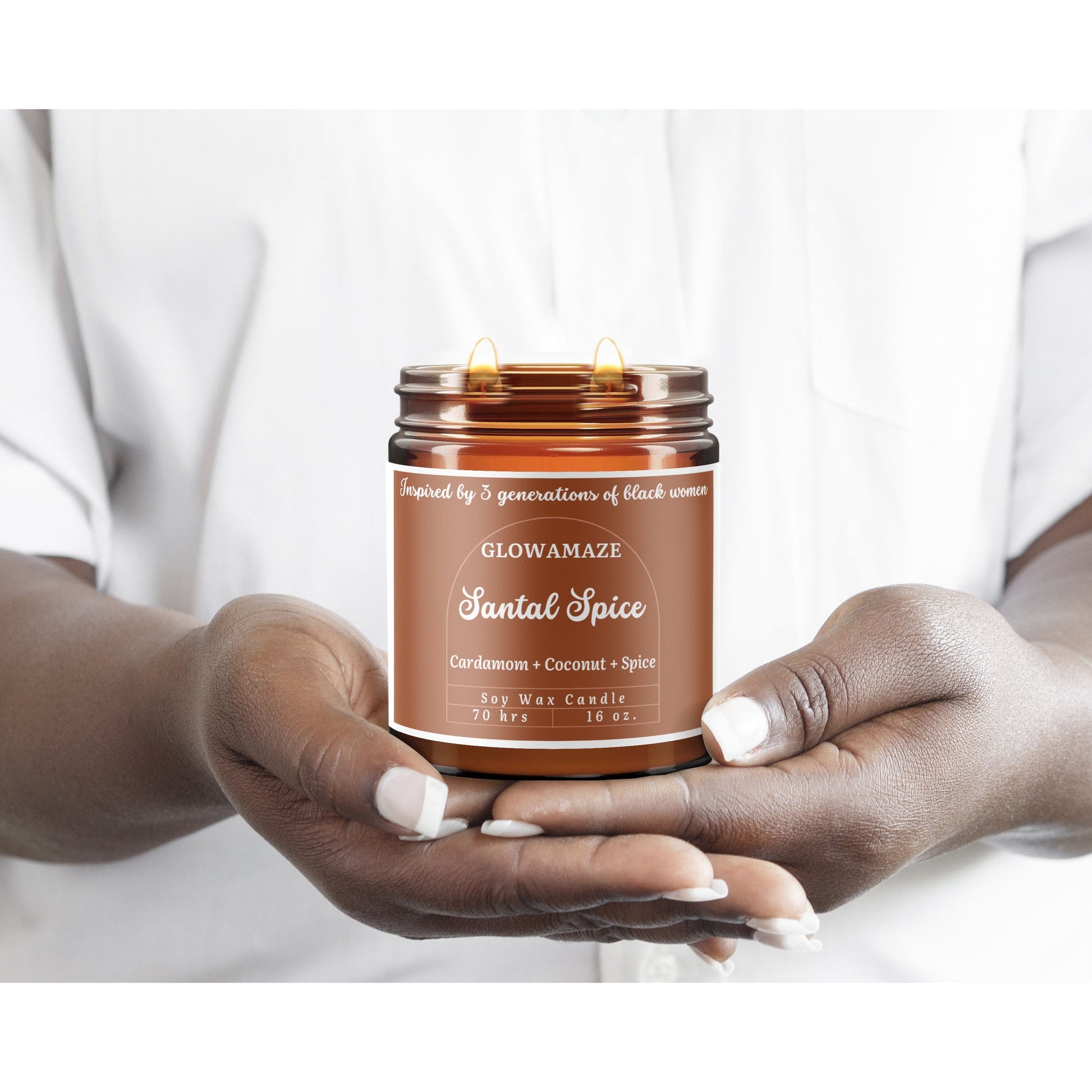 The GlowAmaze SANTAL SPICE Soy Candle smells like a delightfully unique treat! This gourmand spice candle is infused with rich cream, exotic black cardamom, coconut, cinnamon, chestnut, and spice.